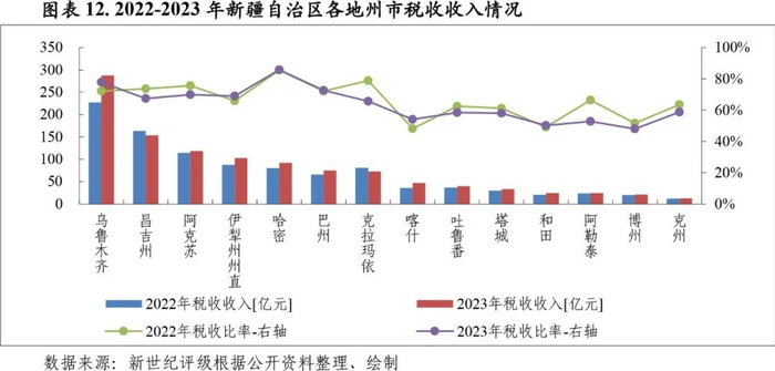 2023年,在上年大规模增值税留抵退税导致的低基数效应下,各地州市一般公共预算收入总体实现恢复性增长。其中三产占比较高的乌鲁木齐市在需求修复带动下增速较上年大幅回升,一般公共预算收入规模仍显著领先于其他地州市;资源型城市昌吉州、克拉玛依市和哈密市受煤炭、原油等大宗商品价格回落影响,一般公共预算收入增速较上年放缓,其中昌吉州和克拉玛依市税收收入同比下降;阿克苏地区和伊犁州州直一般公共预算收入规模排名位于昌吉州和克拉玛依市之间,2023年实现较快增长;阿勒泰地区得益于矿业权出让,当年非税收入大幅增长,带动一般公共预算收入同比增长30.1%居全区第一,规模超过博州,但两地仍与克州排名全区倒数三位。当年哈密市税收比率仍居于全区首位,乌鲁木齐市和巴州次之,其余大部分州市该比率仍偏低;此外,新疆各州市财政收支平衡对上级转移支付的依赖度较高,南疆边境地区尤为明显。2024年上半年度,新疆各州市一般公共预算收入均实现正增长,大部分地区同比增速在两位数以上,其中阿勒泰地区、塔城地区增速领先,而哈密市和乌鲁木齐市则分别受煤炭等主要矿产品价格持续低位运行,以及涉房涉土税收下降等影响,以微增长垫底。