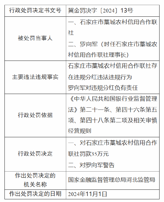 石家庄市藁城农村信用合作联社被罚35万元:因违规分红