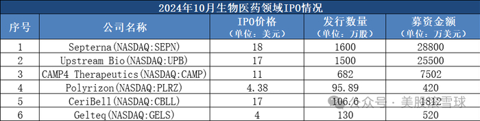 10月是生物医药公司IPO的传统旺季,共有6家医药企业采取IPO的形式上市,融资规模达6.46亿美元。