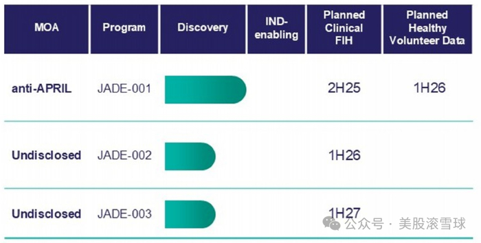 Jade的重点是开发针对炎症和免疫相关疾病的疗法,目前在研管线均处于临床前阶段,其中进度最快的JADE-001是一种潜在的同类最佳抗体,旨在阻断APRIL(“增殖诱导配体”)蛋白,计划于2025年下半年进入治疗IgA肾病的临床试验,初步数据预计将于2026年上半年公布。