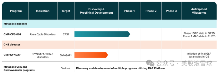 目前,CMP-CPS-001正在针对尿素循环紊乱 (UCD)进行临床一期试验,预计将在2025年一季度报告单次递增剂量 (SAD) 部分试验的所有四个队列的数据,并在2025年下半年报告多次递增剂量 (MAD) 部分试验的数据。CMP-CPS-001已获得美国FDA已授予的孤儿药资格认定与罕见儿科疾病资格认定。