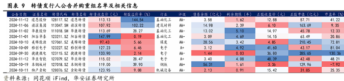 2024年9月24日,中国证监会发布了《关于深化上市公司并购重组市场改革的意见》,旨在进一步激发并购重组市场活力,支持上市公司转型升级和高质量发展。9月24日开始,上市公司陆续公告进行并购重组,机械设备、基础化工行业上市公司及转债发行人响应积极。截至11月15日,据不完全统计,已有123家上市公司公告进行并购重组。其中有10家公司为转债发行人,如道恩股份、华康股份、阳谷华泰等。
