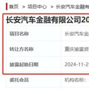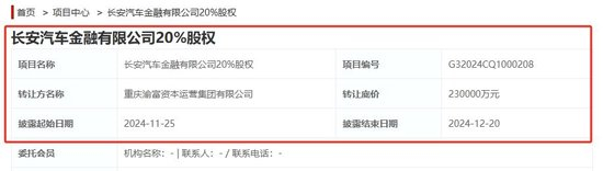 财联社11月25日讯(记者 邹俊涛)11月25日,财联社记者从重庆产权交易网获悉,长安汽车金融有限公司(下称“长安汽车金融”)20%股权正在被公开挂牌转让。信息披露起止日期为2024年11月25日至2024年12月20日。