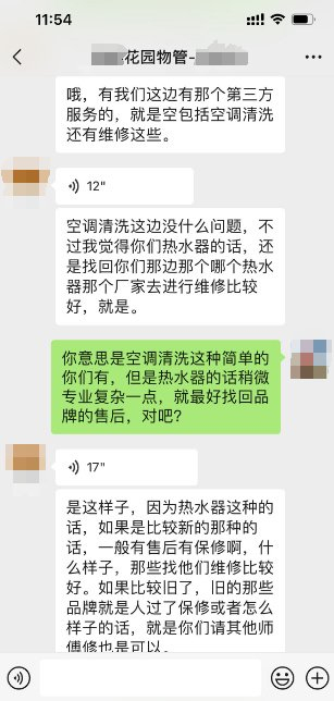 调研员通过聊天软件向小区物管申请三项测评服务。物管负责人回复风扇灯安装由物业工程处的电工师傅负责,可预约当天上门,但价格待上门后确认,无法提前告知;空调清洗由第三方服务提供,需要另外预约时间。对于热水器维修,物管建议调研员自行寻找品牌售后跟进。