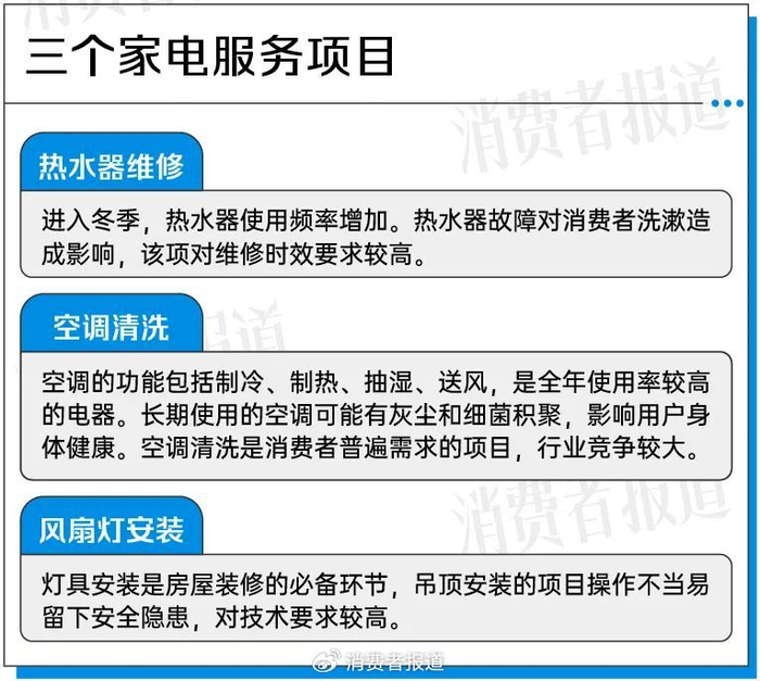 换言之,从消费者角度出发,一次合格的家电维修服务应该能避开以上消费痛点,让他们放心无忧。实践是检验真理的唯一标准。《消费者报道》决定对小区物业、线下维修小店、第三方维修服务商啄木鸟提供的家电服务进行一次实测。测评的项目包括热水器维修、空调清洗和风扇灯安装。