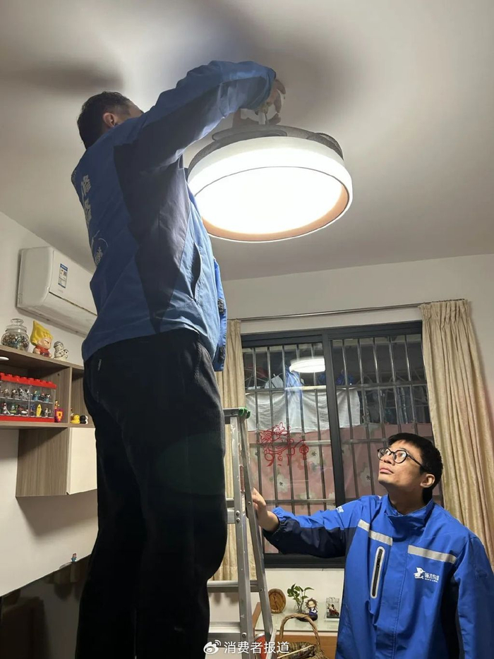 在两名维修工程师完成风扇灯安装后,调研员临时增加全屋吸顶灯检修要求。经确认两盏LED吸顶灯光源模组损坏后,对方提供了一线品牌全新零部件进行更换,并就额外产生的配件费提前征求调研员同意。