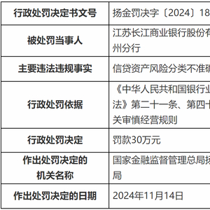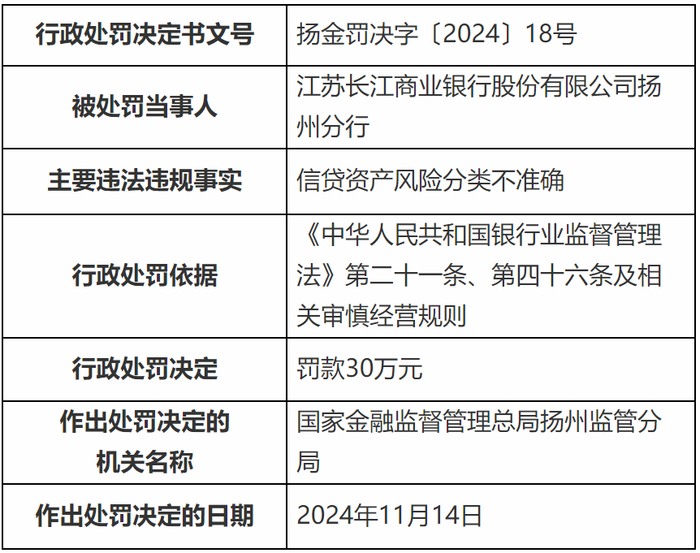 行政处罚信息公开表显示,江苏长江商业银行股份有限公司扬州分行因信贷资产风险分类不准确的主要违法违规事实,被国家金融监督管理总局扬州监管分局罚款30万元。