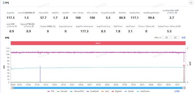 在OPPO Reno13上还针对国民级手游《王者荣耀》进行了定制化调优,确保体验控温处在平衡的状态下。经过实测,OPPO Reno13在极致帧率+极致画质下运行一局《王者荣耀》5V5对战后,平均帧率为117.3帧,机身温度触感与体温接近,整体表现相当优秀。