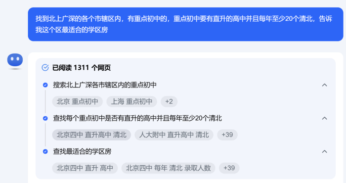 编辑就“找到北上广深的各个市辖区内,有重点初中,还有直升高中并且每年至少20个清北,告诉我这个区最适合的学区房”这一较为复杂的指令,对Kimi探索版、Kimi普通版和另两款知名AI产品进行测试。