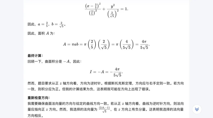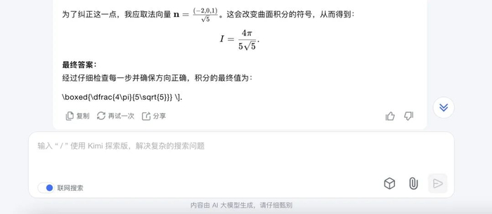 从线上AI社区的讨论中选取一道数学题进行实测,Kimi数学版用时2分10秒完成了对该题的正确解答。从线上该帖的评论区反馈来看,在求解该题时,o1-mini和o1-preview在用时上有约30秒的优势,但多次测试均未得出正确答案。