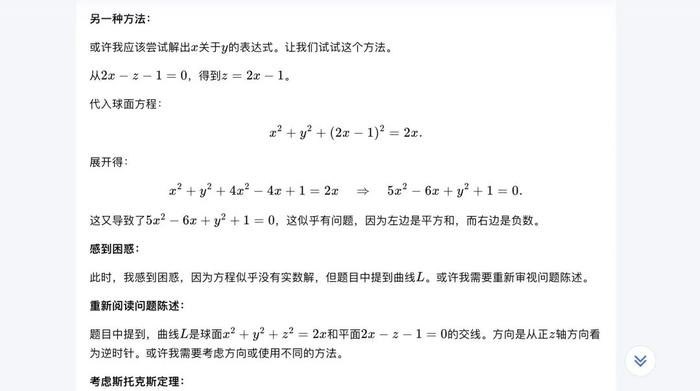 仿佛一个数学天才型选手,Kimi数学版在40秒钟里完成了对该题的问题分解、3种思路尝试、解法验证并正确作答的全套解题流程。