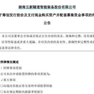 五新隧装公告称,本次交易目前正处于筹划阶段,交易各方尚未签署正式的交易协议,具体交易方案仍在商讨论证中,尚存在不确定性。本次交易尚需公司董事会、股东大会审议,并需经有权监管机构批准,能否通过审批尚存在不确定性,敬请广大投资者注意投资风险。