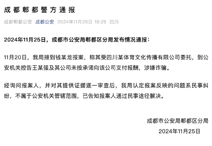 11月25日晚,成都市公安局郫都区分局发布情况通报称,11月20日,该局接到钱某龙报案,称其受四川某体育文化传播有限公司委托,到公安机关控告王某强及其公司未按承诺向该公司支付报酬,涉嫌诈骗。