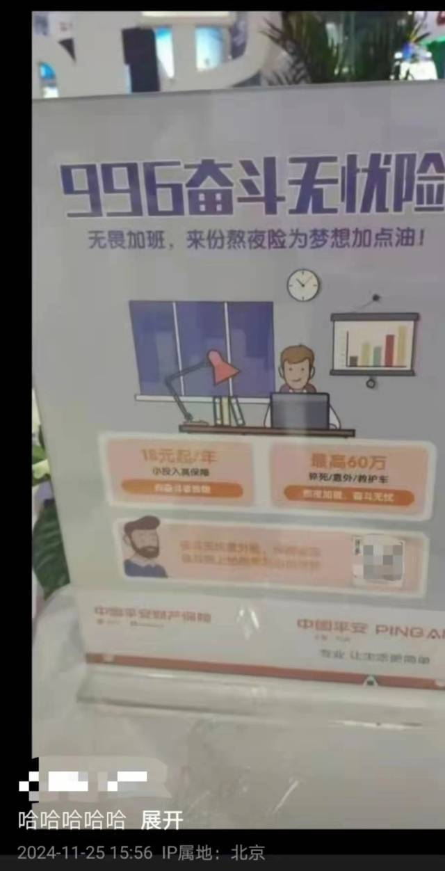 11月25日,有网友发视频,反映了一个名为“996奋斗无忧险”的保险产品宣传牌。关于此险种,该牌子介绍其为“熬夜险”“奋斗无忧意外险”,缴费为18元起/年,赔偿方面,为“最高60万,猝死/意外/救护车。”牌子下方落款为“中国平安”。