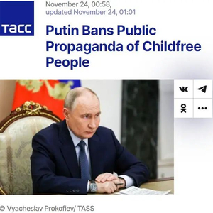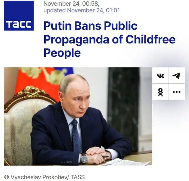 据俄罗斯塔斯社24日报道,俄罗斯总统普京在23日签署了关于禁止宣传不生育思想的法案,该法案此前已在俄国家杜马获得通过。