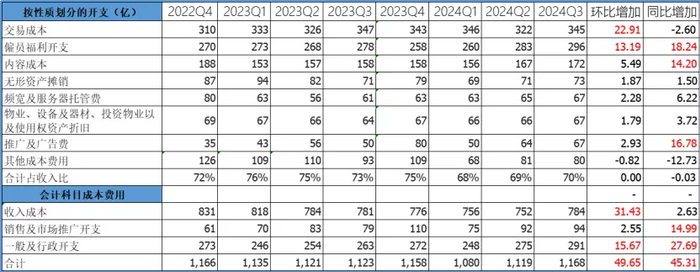 2024年Q3收入成本、销售及市场推广开支、一般及行政开支等总1168亿,相比2024年Q2的1119亿元,增加了50亿,