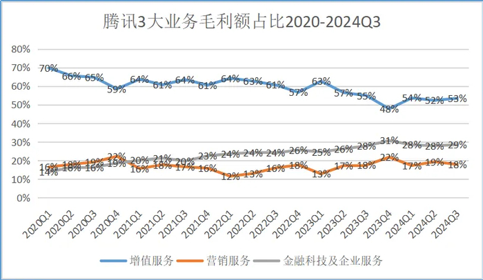 增值服务收入占比49%,贡献53%的毛利总额,游戏依然是腾讯的利润扛把子。