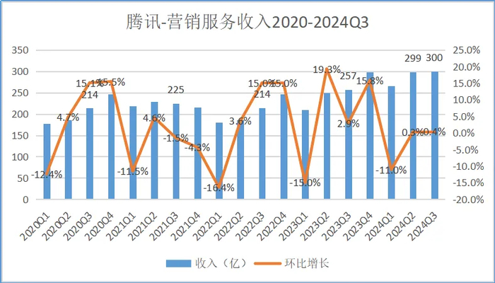 2024年Q3营销服务收入300亿,同比增长16.6%,环比持平%。