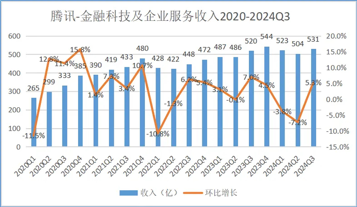 2024年Q3金融科技与企业服务收入531亿,同比增长2%,环比增长5.3%。