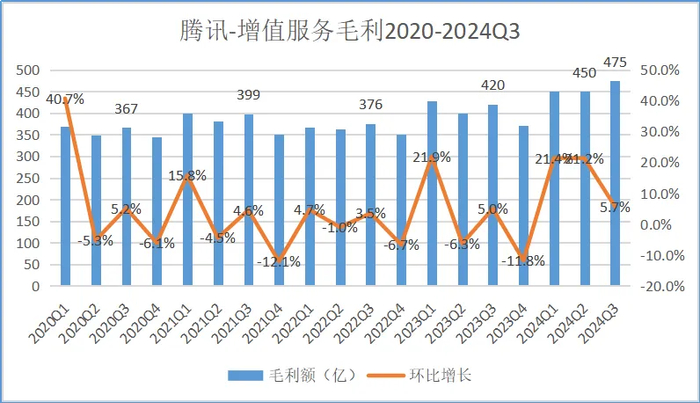 增值服务的毛利金额475亿,同比增长13%%,环比增长5.7%,增加25.5亿。