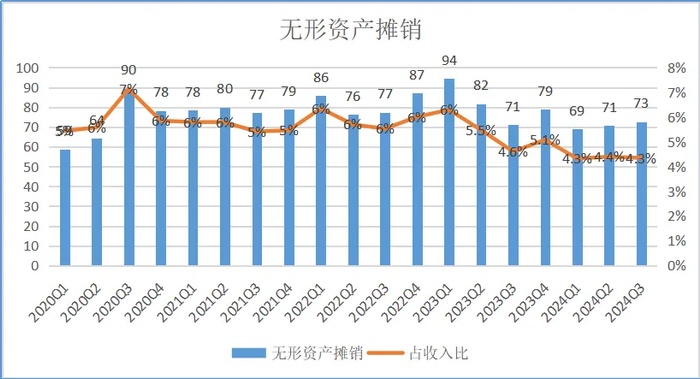 2024年3季度无形资产摊销73亿元,占收入4.3%,继续维持在低位。