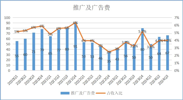 2024年Q3推广及广告费用67亿,环比增加3亿,占收入比为4%。