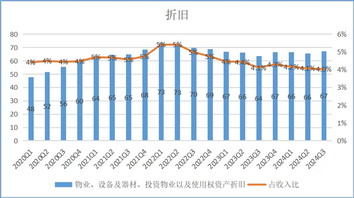 物业、设备及器材、投资物业以及使用权资产折旧比较稳定,占收入比约4%左右。