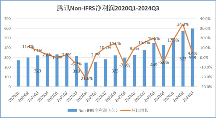 2024年Q3非国际财务报告准则权益持有人应占盈利(Non-IFRS净利润)598亿,同比增长33.2%,环比增长4.4%,创历史新高。