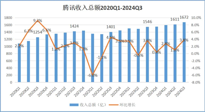 腾讯上周发布2024年3季度业绩,收入1672亿,同比增长8.1%,环比增长3.8%,其中: