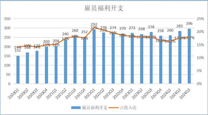 最近4年的雇员福利开支较高,主要因为股权激励的费用,之后年度会逐步减少。