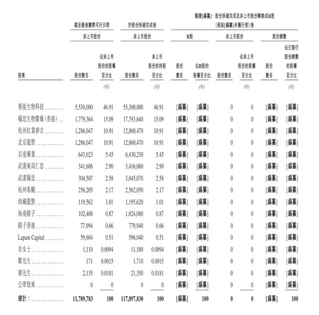 翰思艾泰自成立以来获得三轮投资,招股书显示,根据上市规则, 张发明、张万明、蔡张生物科技、翰思生物医药(香港)、HanxBio (BVI)、Hanx Biopharmaceuticals、武汉翰思及Caizhang Vision将被推定为一组控股股东。截至最后可行期,蔡张生物科技持有的非上市股份最高,达到46.91%。