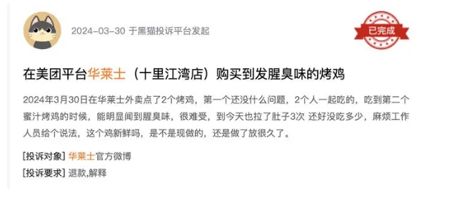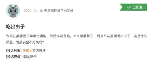据新浪黑猫投诉平台,以华莱士为关键词在黑猫投诉平台搜索发现,共发现8682条相关投诉,其中不少投诉内容涉及食品安全,比如发现异物、食材不熟、食物发臭/变质等。