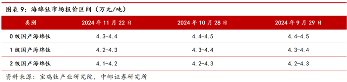 海绵钛价格跟踪:宝鸡钛产业研究院11月22日给出海绵钛市场报价区间:0级国产海绵钛价格4.3-4.4万元/吨;1级国产海绵钛价格4.2-4.3万元/吨;2级国产海绵钛价格4.1-4.2万元/吨。