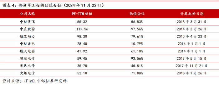截至2024年11月22日,中证军工指数为10760.59,军工板块PE-TTM估值为73.59,军工板块PB估值为3.00。军工板块PE-TTM估值和PB估值均处于历史中部位置,自2014年1月1日起,历史上有66.28%的时间板块PE-TTM估值低于当前水平,37.77%的时间板块PB估值低于当前水平。