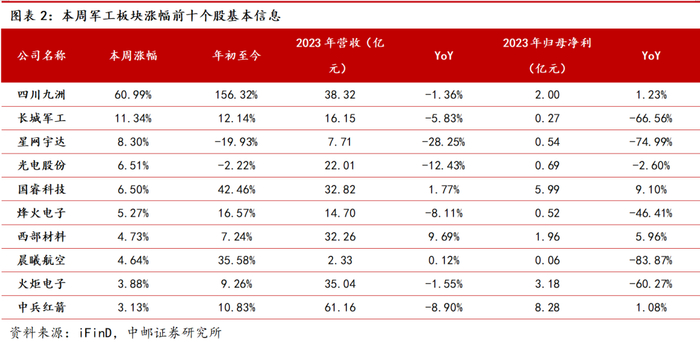 本周军工涨幅前十的个股为:四川九洲(+60.99%)、长城军工(+11.34%)、星网宇达(+8.30%)、光电股份(+6.51%)、国睿科技(+6.50%)、烽火电子(+5.27%)、西部材料(+4.73%)、晨曦航空(+4.64%)、火炬电子(+3.88%)、中兵红箭(+3.13%)。