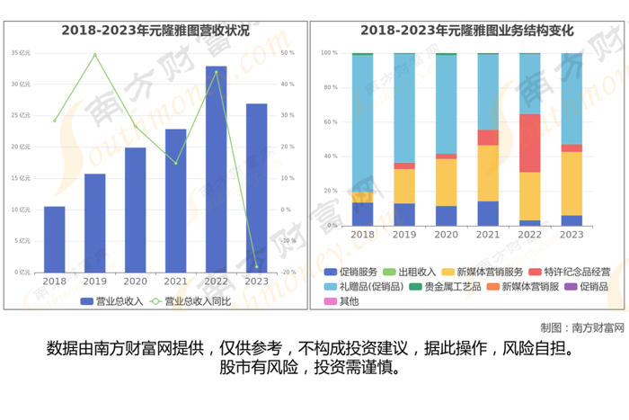 元隆雅图于2017年6月6日在深圳证券交易所上市,公司主营业务为(1)为客户供应礼赠品,收入体现为产品销售收入;(2)为客户提供数字化营销管理和执行服务,包括基于APP和小程序的数字化活动整体解决方案,基于私域流量的电商平台开发和运营,收入体现为服务收入;(3)新媒体营销业务,向品牌客户提供基于微信,微博,抖音,快手等互联网媒介的营销服务。