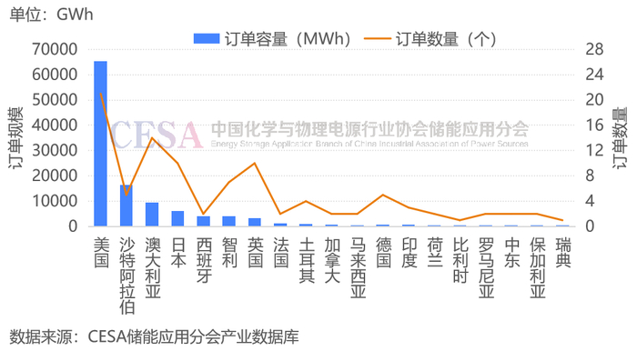 其中,中国企业斩获美国储能订单最多,规模最大,达21个,总规模超65GWh,占比56.5%。沙特阿拉伯5个订单,共16.36GWh,占比14.15%。澳大利亚14个订单,共9.573GWh,占比8.28%。此外,还分别斩获日本6.1GWh、西班牙4.1GWh、智利3.976GWh、英国3.226GWh、法国1.223GWh、土耳其1.015GWh订单。