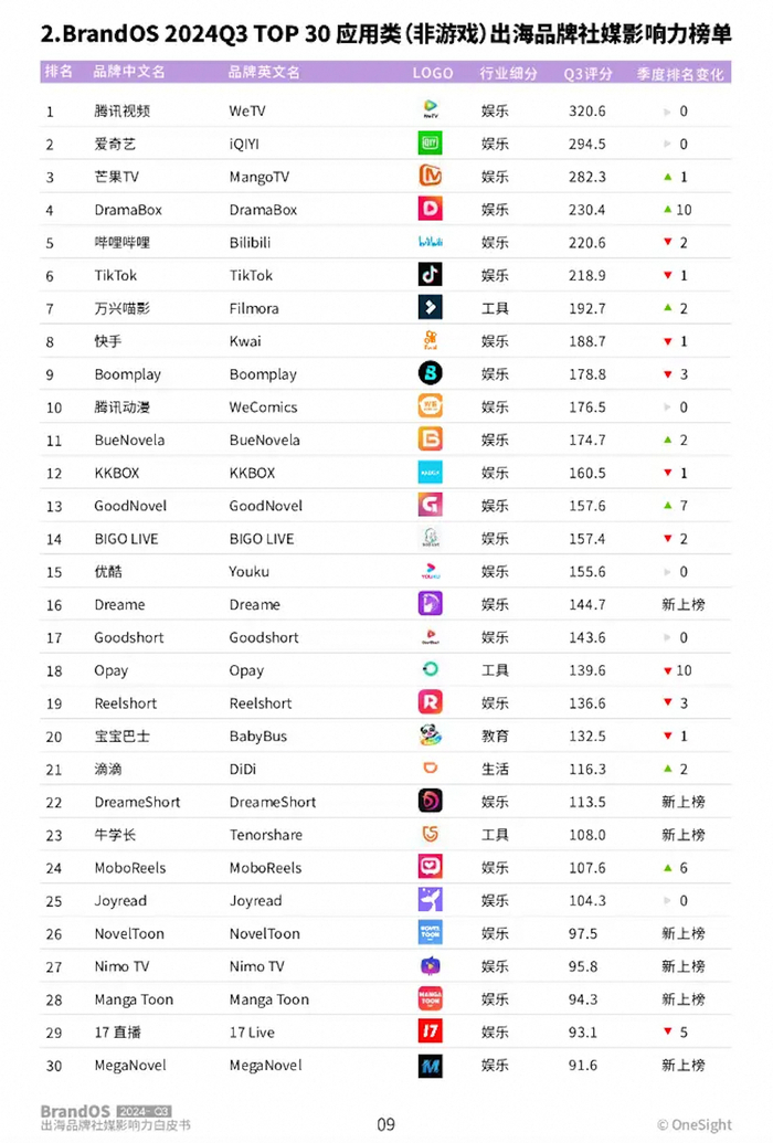 根据OneSight对2024年Q3应用类(非游戏)出海品牌社媒影响力榜单的统计,前三名分别为腾讯国际版、爱奇艺国际版、芒果TV国际版。这三家国际版在海外市场的用户量、下载量、内容质量等方面不相上下,且都以东南亚为主要市场。