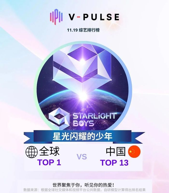 前不久,节目中的选手还登上了韩国大型音乐颁奖典礼KGMA的舞台。而根据V-Pulse海外热度榜显示,截至11月19日,《星光闪耀的少年》登顶综艺排行榜TOP1,只能说这档选秀节目的品牌影响力及选手的商业价值仍在上升。