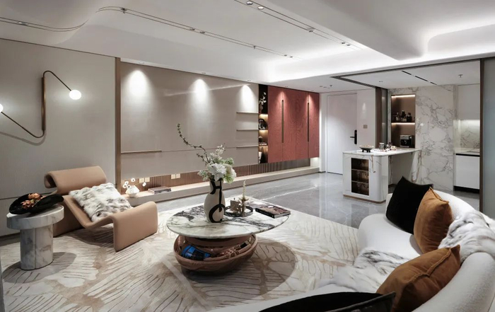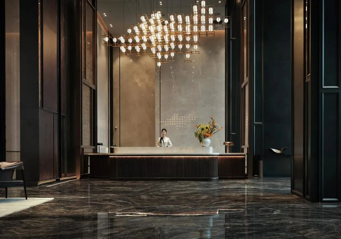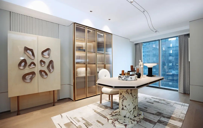 在最卷的入户空间打造上,金融悦以五星级酒店的审美为基准,呈现出挑高约11米、面积超300㎡、宝格丽风格的艺术大堂。为了匹配项目的精致感,更是以进口艺术石材、金箔艺术屏风等作为装饰,造价不菲,为业主带来艺术空间般的享受,尊崇及仪式感十足。