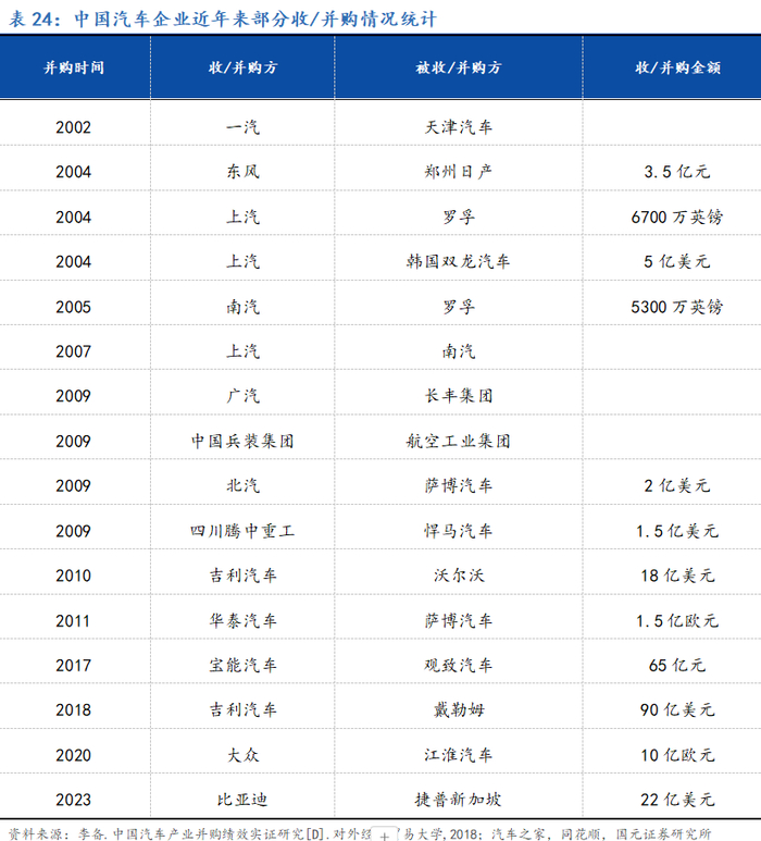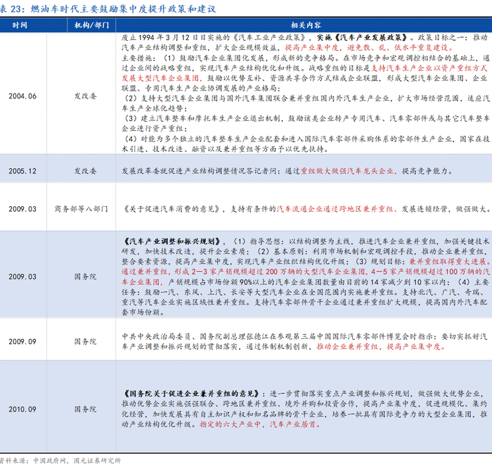 产业发展行至中段,集中度提升渐成趋势,关注高质量并购发展机会。从产业发展的角度看,渗透率进入50%左右阶段,产业生命周期曲线进入发展中后段。该阶段以后行业增长速度开始自然放缓,行业竞争加剧。行业企业一方面寻求未来新曲线的开拓,另一方面,在原有曲线激烈竞争的基础上,开启并购发展等方式,推进行业整体优胜劣汰,集中度提升,有序实现高质量发展。从中国汽车发展的历史来看,燃油车阶段我国已经经历过一轮产业成长中后段的并购发展阶段,在政策与市场力量的共同推动下,本世纪初以来主要燃油车企业经过多轮并购、投资、合资合作以及海外并购,逐渐形成了实力较强的国企、民企整车体系和产业环节完整的汽车零部件体系,为后续的新能源汽车快速发展奠定了良好的产业基础。