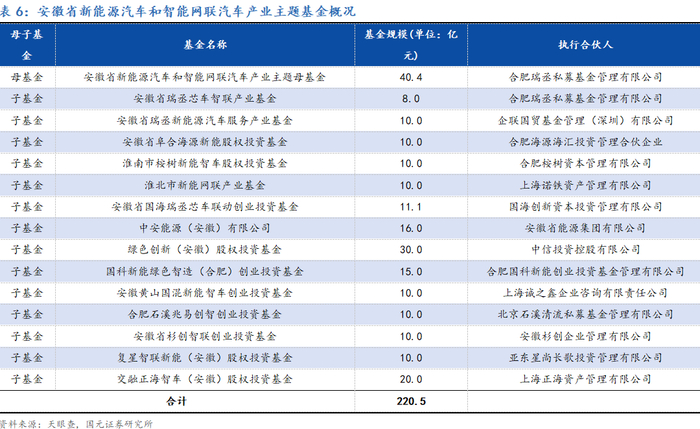“双招双引”模式逐步成熟,财政资金杠杆效应逐步凸显。2023年3月《安徽省新兴产业引导基金管理办法》印发实施,标志着以国资平台为基础,以股权投资为支点,通过投资、组建基金进行招商引资,发展当地战略性新兴产业的模式进一步成熟。同年,根据《安徽省新兴产业引导基金管理办法》要求,安徽省新能源汽车和智能网联汽车产业主题基金正式成立,初定基金总规模180亿元,以母子基金架构运行。其中,母基金规模40.4亿元,存续期10年,合肥瑞丞私募基金管理有限公司为母基金管理机构,母子基金主要投资额需投向整车制造、零部件、材料、设备制造、汽车服务等六大领域,助推安徽省新能源汽车和智能网联汽车产业提质扩量增效和“双招双引”。截至2024年6月,安徽省新能源汽车和智能网联汽车产业主题基金已拥有十四只子基金,产业主题基金总规模已超额完成初定目标规模,达到220.5亿元。