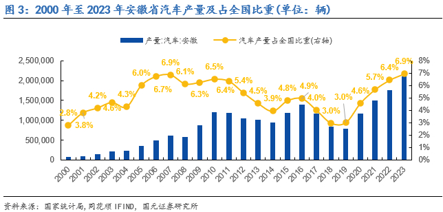 汽车产量方面:2000年至2023年期间,安徽省的汽车产量实现了从5.7万辆到249.1万辆的巨大飞跃,期间年均复合增长率达17.8%。全国汽车产量份额方面,安徽省从2018年的3.0%逐年攀升至2023年的8.3%。2024年上半年,安徽省在分省市排名中已跃升至第三名,产量份额在全国排名中仅次于广东、重庆两大汽车产业重镇。我们认为安徽省份额近几年显著增长的外部原因在于我国自主品牌的强势崛起,内部原因则在于区域产业聚集发展到一定阶段后的涌现效应及地方政府的政策支持:自2018年以后,自主品牌依托不断的技术创新、产品质量与服务的持续优化,以及消费者对国产汽车品牌认知的积极转变,逐步在市场竞争中展现出了相对于合资车企的明显优势。而江淮汽车与奇瑞汽车,作为安徽省自主品牌的双璧,充分受益于自主车企崛起的浪潮,带动产业链在合肥-芜湖双城聚集,优化区域产业资源要素,同时叠加安徽省政府前瞻性的产业政策和规划布局,比亚迪、蔚来等新能源车企在安徽省先后聚集,持续放量,在带动安徽汽车产业省份额快速提升的同时,也进一步优化区域产业资源要素,形成互相带动的飞轮效应,为安徽省汽车产业进一步高质量发展储备了充足的能量。