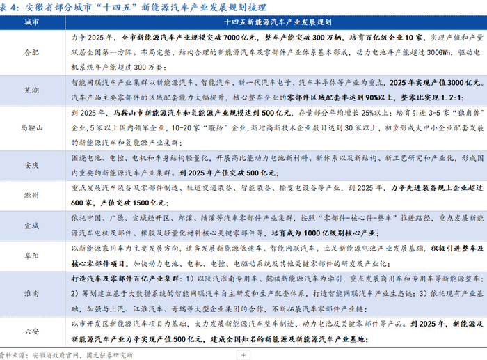 安徽省16个省辖市已全员“出动”,合力助推新能源车产业深化变革。空间布局方面,安徽省内十六市全员出动,潜心布局汽车产业各细分领域,力争整合资源、分工合作、形成合力,并已形成以“合肥-芜湖”为双核,其他市多点支撑的一体化产业布局。同时,根据安徽省各市发布“十四五”期间产业发展目标来看,至少有合肥、芜湖、马鞍山、安庆、滁州、宣城、阜阳、淮南、六安9个城市对汽车产业设定了较为明确的目标。