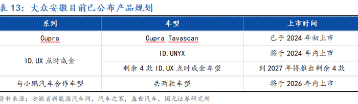 基于本土供应链本土技术结盟的方式,维持集团全球核心竞争力。不同于其他传统合资企业,大众安徽在战略规划上采取了与本土合作伙伴结盟的创新路径,深化本土化新能源车核心供应链的构建。在动力电池方面,大众汽车集团(中国)于2020年宣布投资约11亿欧元,成为国轩高科最大股东,拥有其26.47%的股份。目前,双方成立了联合项目团队,主攻标准电芯研发,并可匹配大众旗下的平台体系;在电子电气架构研发方面,2024年2月,大众汽车集团与小鹏汽车共同宣布,双方已签署平台与软件联合开发技术合作协议与EEA电子电气架构技术战略合作框架协议,双方宣布将基于小鹏汽车最新一代电子电气架构,联合开发并将其集成到大众汽车在中国的CMP平台上;在智能驾驶研发方面,大众旗下的CARIAD于2023年与地平线成立合资公司,开发达到L4级别的高度优化的全栈式高级驾驶辅助系统和自动驾驶解决方案,并搭载于大众汽车集团本土的纯电动车型上;在智能座舱与智能网联功能研发方面,大众旗下的CARIAD于2023年与中科创达成立合资公司,专注本土座舱信息娱乐系统及智能网联功能研发。在产品规划方面:截至目前,大众汽车集团基于MEB平台打造的Cupra Tavascan电动车型目前已在大众安徽全新纯电动汽车工厂实现量产,并将反向出口至欧洲市场。另外,目前大众安徽已公布旗下新品类名称——ID.UX点时成金,该品类下的全部新车都将采用金色大众徽标。其中,ID.UNYX是该系列首款车型,并已于2024年7月正式上市。此外,大众汽车与小鹏汽车联合开发两款中型智能网联车型已确定于2026年上市。