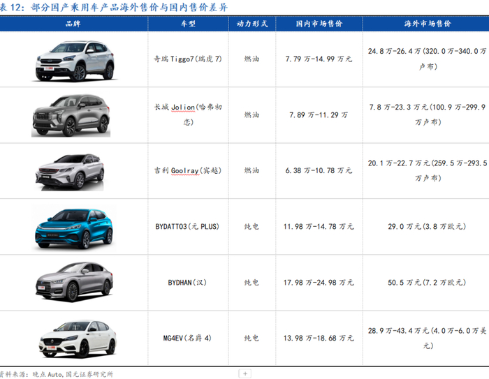 近几年我国汽车出海实现跨越式的增长。近年来,中国自主品牌汽车在智能化、电动化、研发/生产、产业链整合等方面已获得长足进展。此外,随着碳中和进程加快,我国加大对自主品牌和新能源汽车的扶持力度,为中国自主品牌车企出海提供强大动力。虽然我国汽车出海面临众多困难和挑战,但是疫情下由于全球市场供给不足、国际形势动荡等因素,为我国汽车出海实现跨越式的增长提供了契机。同时在国内市场持续的价格战与“内卷”之后,中国乘用车产品从产品力与价格竞争力角度迎来了全球化的领先时刻。举例来看,比亚迪元PLUS(ATTO3)国内售价为11.98-14.78万元,而同款车型的海外市场售价则为3.8万欧元,换算成人民币为29.0万元。