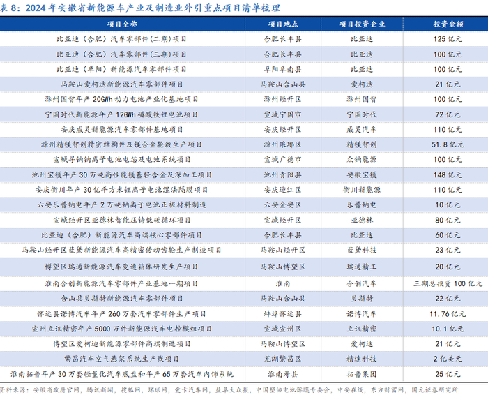 “双招双引”成绩斐然,高效助推安徽省汽车产业布局。安徽省的新能源车与智能网联汽车产业链在发展中,通过实施产业链招商、基金招商、平台招商等多元化招商策略,成功构建了具有竞争力的产业生态体系。以合肥市为例,作为省内双核之一,2023年合肥市成功引进151个新能源汽车和智能网联汽车产业项目,协议投资额高达1158亿元人民币。其中包括大众全球第二研发中心、深向科技新能源重卡项目、江淮高端乘用车项目、招商检测华东基地以及踏歌智行特种车辆无人驾驶全国总部等重点项目。