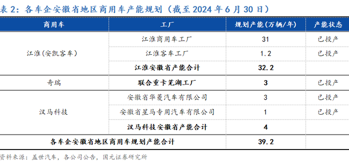 截至目前,安徽省已成功通过投资扶持和政策引导,积极培育了包括蔚来汽车、大众安徽、比亚迪合肥在内的国内外知名整车制造企业。上述企业与本土的江淮汽车和奇瑞汽车等传统制造商共同构建起一个多元化且完整的整车制造企业矩阵。目前,安徽省在乘用车领域的链主企业包括奇瑞汽车、江淮汽车、蔚来汽车、大众安徽、长安汽车和比亚迪。根据我们梳理,上述六家整车企业在安徽省本地的规划产能总计达到577万辆。在商用车领域,链主企业则包括江淮汽车、奇瑞汽车和汉马科技,上述三家企业的本地产能布局总计为39.2万辆。