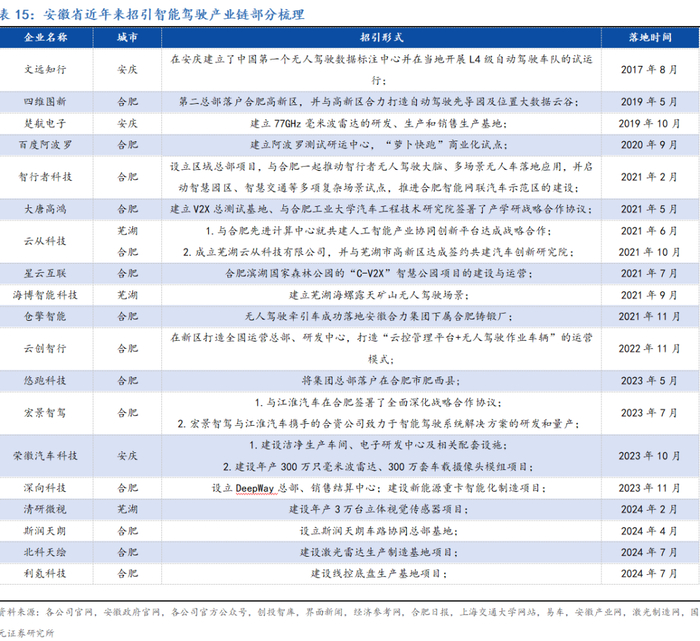 外部招引与本地研发并举,安徽省智能驾驶产业链加速发展。2021年,安徽省颁布了《新能源汽车和智能网联汽车产业“双招双引”实施方案》,其中将构建“智能汽车生态”作为核心发展目标之一。该方案明确提出到2025年,预计实现中高级智能汽车在特定环境下的市场化应用,并培育出一批业务规模超10亿元的智能汽车零部件企业,以推动产业的规模化和集群化发展。