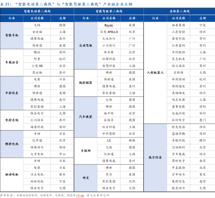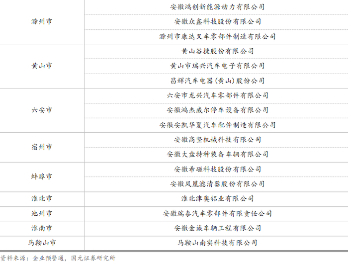 在深厚产业积累与体系化的成功经验支撑下,伴随新能源车产业进入智能网联“下半场”,安徽省进一步明确了产业发展的方向。2023年,汽车产业已成为安徽省引领发展的优势产业,同时安徽省十六市全员出动,潜心布局汽车产业各细分领域,力争整合资源、分工合作,形成合力,并形成以“合肥-芜湖”为双核,其他市多点支撑的一体化产业布局,构建新能源汽车“3小时产业圈”。在资金支持方面,省发改委于2023年宣布设立财政专项资金,计划在五年内设立超过1000亿元的汽车产业链投资基金,继续加速技术研发和产业升级的步伐。在长期深耕与政策的推动下,安徽省也涌现出了一系列产业链优势企业。从整车链主江淮、蔚来和出海领先企业奇瑞,到关键零部件上市公司国轩高科、阳光电源、伯特利、中鼎股份、瑞鹄模具以及一级市场大卓智能、森思泰克等,持续助力产业蓬勃发展。